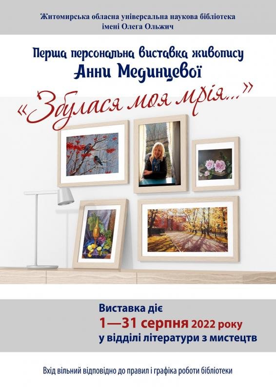 З 1 по 31 серпня 2022 року у відділі літератури з мистецтв діє перша персональна виставка живопису Анни Мединцевої «Збулася моя МРІЯ...»
