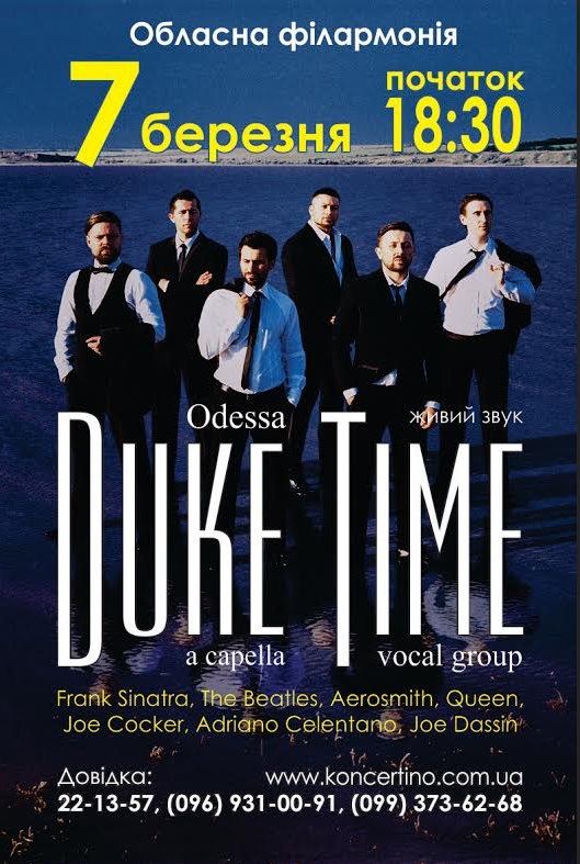 Група DukeTime (ДюкТайм) – чоловічий вокальний секстет – утворилася в серпні 2004 року в Одесі. Теперішній склад групи функціонує з лютого 2005 року і до нього вхо-дять шість професійних вокалістів: бас, три баритони и два тенори. Направленння, у яко-му працюють музиканти – виключно a capella.