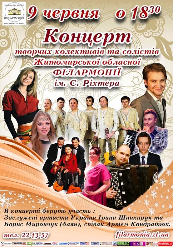 В концертній залі філармонії відбудеться концерт творчих колективів та солістів Житомирської обласної філармонії ім. С. Ріхтера.