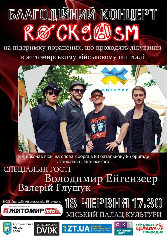 Окрім гурту RockGasm для житомирян виступлять фронтмен гурту “Шабля” Володимир Ейгензеер та підполковник ЗСУ Валерій Глушук зі своїми авторськими піснями.
