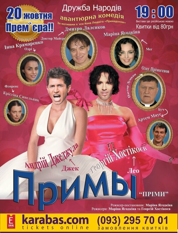 Кто же не слышал о комедии «В джазе только девушки»? Феерическая комедия «Примы», по мотивам пьесы «Примадонны» известного американского драматурга Кена Людвига напоминает именно этот фильм своими сногсшибательными перипетиями, переодеваниями и авантюрной атмосферой. Насколько это легкое дело для мужчины притворяться женщиной? И достаточно ли только научиться ходить на каблуках и надеть женское платье? Именно это придется проверить на себе Георгию Хостикоеву (известному актеру театра и кино) и Андрею Джеджуле (популярному теле, радио ведущему и актеру). Их персонажи – актеры Лео и Джек, после неудачного выступления случайно узнают, что миллионерша преклонных лет разыскивает своих племянниц, которые потерялись в детстве, чтобы отдать им свои миллионы. Миллионы, ради которых можно рискнуть и сыграть комедию с переодеванием в женские платья! Тем не менее миллионы так просто не получишь! Проблемы подстерегают героев нашей комедии каждую минуту: во-первых, у бабки уже есть одна наследница Мэг (Марина Ягодкина), во-вторых, делить наследство совсем не собирается влюбленный не столько в Мэг, сколько в ее наследство пастор Дункан (Олег Примогенов), в - третьих, бабуля (Кристина Синельник) оказывается очень живучей, а авантюрист доктор Майерс (Дмитрий Лаленков) и его сын – начинающий-качок Буч (Артем Мяус) также имеют свои планы на наследство миллионерши. А наивная и прямолинейная Одри (Инна Крамаренко) невольно становится соучастницей «мошенниц». Ну и конечно, все планы героев меняет любовь.