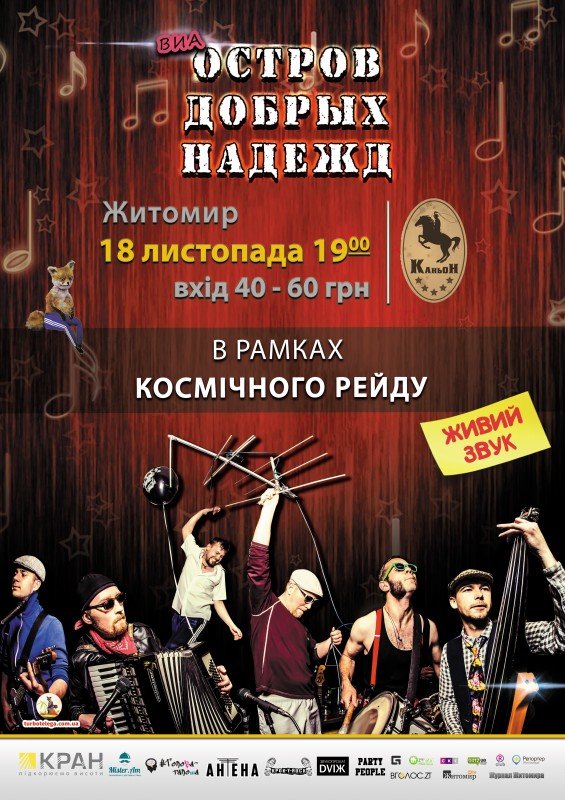 Відчуваєте особливу електризацію повітря навколо та непереборне бажання драйвово відпочити під енергійну музику? То «турбо-тєлєга» розсіює флюїди потужної музичної хвилі і від них реально тяжко сховатися! Тож Ви вже, мабуть, здогадалися, що відомий житомирський гурт ВІА «Остров Добрых Надежд», яскравий та неординарний представник «андеграундної живої активної музики» поширить зону турбо-денсу у рідному Житомирі і дасть великий гала-концерт.