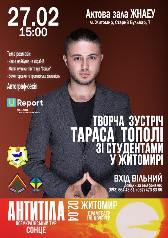 У рамках тематичних поїздок Україною у Житомирі відбудуться дві великі творчі зустрічі лідера гурту «Антитіла» Тараса Тополі зі молоддю, студентами та шанувальниками.