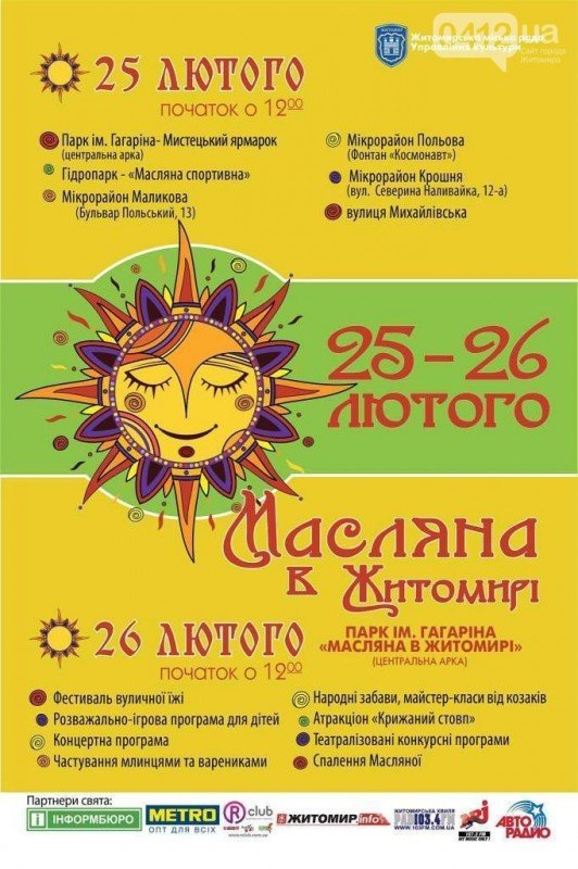 Кульмінація святкування Масляної: Козацькі бої, майстер-класи та розваги, млинці, вареники, конкурси, театралізовані дійства, концерт, виступ АРТС-НОВА, видовищне піро-шоу, діджей Петро-Васильович та багато іншого чекай на житомирян.