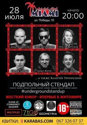 Дамы и господа, леди и джентльмены! Приглашаем вас на уникальное событие, впервые в Житомире – Подпольный Стендап! 28 июля, в пятницу в ART-CLUB "Miami" мы ждем именно тебя и всех совершеннолетних членов твоей семьи, чтобы хорошенько посмеяться.