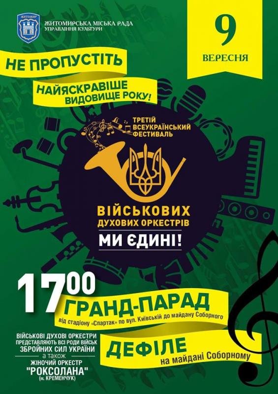 Зустрічайте - Третій всеукраїнський фестиваль - дефіле військових духових оркестрів всіх родів військ Збройних Сил України – 14 оркестрів, 526 військових, 526 музичних інструментів!