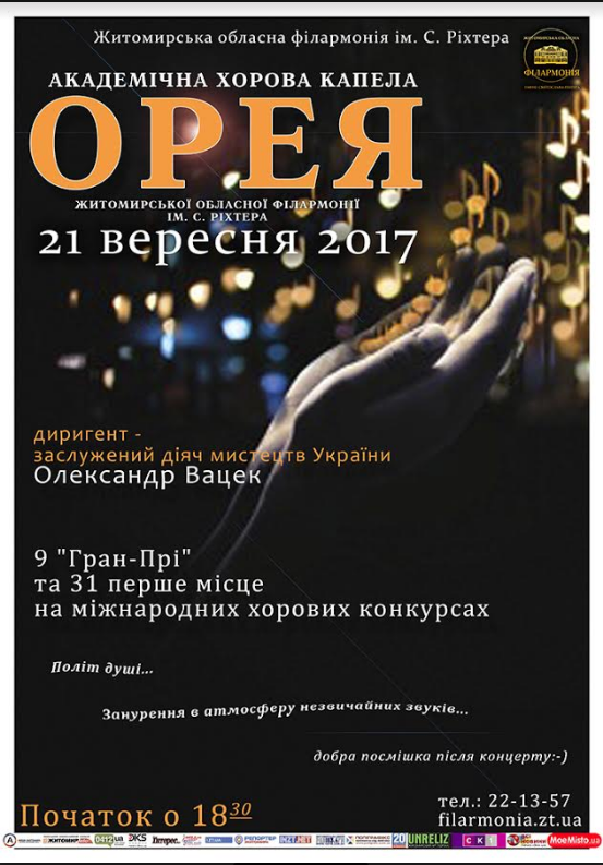 За час свого існування капела виборола дев’ять гран-прі та 35 перших місць на міжнародних конкурсах та фестивалях хорового мистецтва в різних країнах. Хорова капела «Орея» вже давно стала осередком української музичної культури Житомирського краю. Хор виконує різножанрові твори вітчизняних і зарубіжних авторів (духовні, народні, сучасні, оркестрові), володіє різними стилями та манерами співу. В активному репертуарі хору –понад 300 творів а capella.
