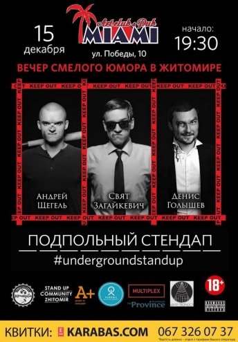 Дамы и господа, леди и джентльмены! Приглашаем вас на уникальное событие,– Подпольный Стендап в Житомире! 15 декабря, в пятницу в ART-CLUB Miami мы ждем именно тебя и всех совершеннолетних членов твоей семьи, чтобы хорошенько посмеяться.