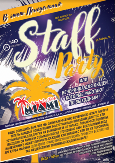 Staff party – это популярный во всем мире формат вечеринок для людей, которые работают по выходным. Рады сообщить вам, что мы запускаем серию вечеринок «Staff party» в Арт клубе Майями! Теперь каждый понедельник мы устраиваем праздник для тех, кто устраивал его для других на выходных и не только. Ломаем стереотипы, выходим за рамки и отдыхаем когда это удобно нам.