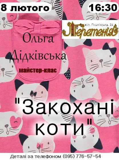 Майстриня та художниця Ольга Дідківська проведе майстер-клас з виготовлення сувеніра «Закохані коти».Творчою лабораторією стане кав’ярня «Теретенія».