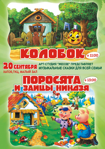 Колобок - Музыкальная сказка для всей семьи.Формат - ростовые куклы. Зрители увидят историю Смелого Колобка, который спасает от Лисы Маленького Зайчонка. Смелость и Дружба побеждает.