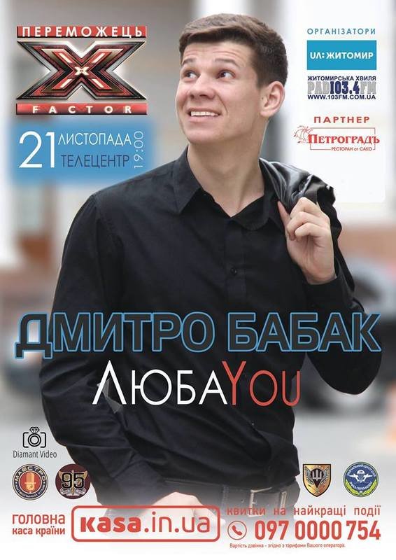 За підтримки Суспільного телеканалу «UA: Житомир» та радіостанції «Житомирська Хвиля» у концертному залі телецентру (вул. Театральна, 7) відбудеться сольний концерт «ЛюбаYou» співака та музиканта, переможця п’ятого сезону вокального шоу «Х-Фактор» - Дмитра Бабака.