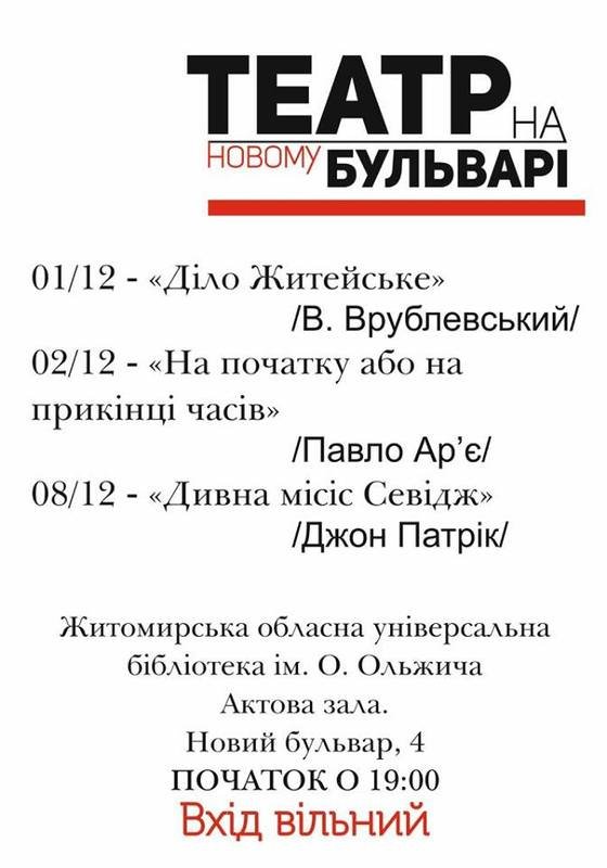 Сатиричну комедію 4 червня 2017 року втілили на сцені актової зали Житомирської обласної універсальної наукової бібліотеки імені Олега Ольжича талановиті актори самодіяльного «Театру на Новому бульварі» під керівництвом головного режисера народного артиста України Григорія Артеменка.