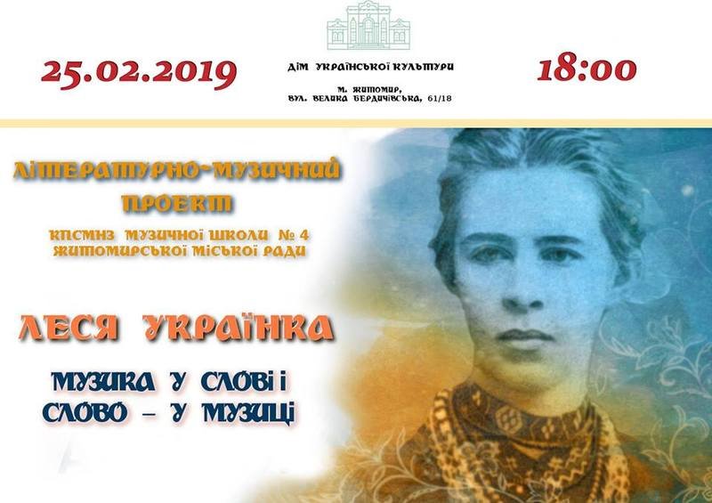 З нагоди 148 річниці дня народження Лесі Українки в Домі української культури відбудеться літературно-музичний проект «Леся Українка. Музика у слові і слово – у музиці», який підготували викладачі та учні КПСМНЗ музичної школи №4 Житомирської міської ради.