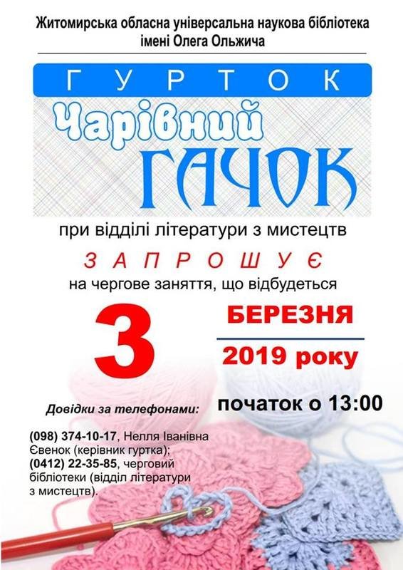 3 березня 2019 року у відділі літератури з мистецтв ЖОУНБ ім. О. Ольжича відбудеться чергове заняття гуртка «Чарівний гачок» на безоплатній основі під керівництвом Неллі Іванівни Євенок.
