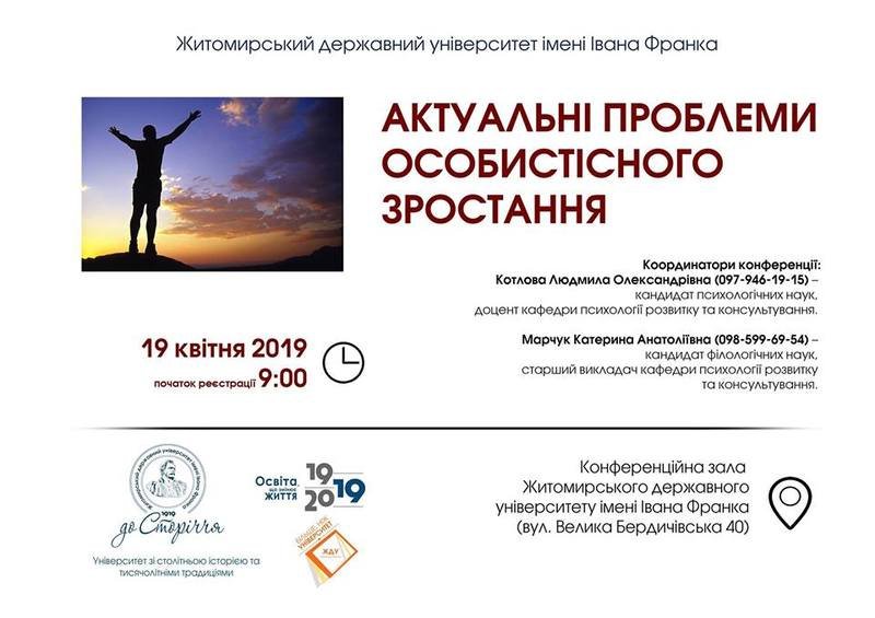 Всеукраїнська науково-практична конференція длямолодих вчених «Актуальні проблеми особистісного зростання» відбудеться 19 квітня 2019 року на базі Житомирського державного фуніверситету імені Івана Франка.