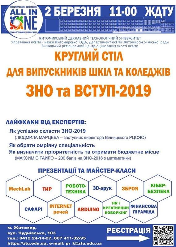 З метою донесення актуальної інформації про особливості зовнішнього незалежного оцінювання у 2019 році, Житомирський державний технологічний університет разом із Вінницьким регіональним центром оцінювання якості освіти 2 березня 2019 року об 11-00 годині проводить тематичний Круглий стіл «ЗНО та ВСТУП-2019».