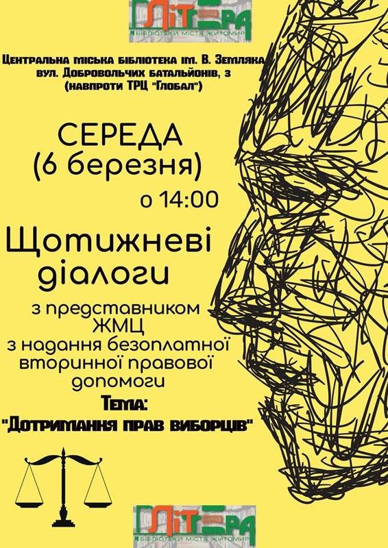 Запрошуємо Вас на "Щотижневі діалоги" із представником Житомирського міського центру з наданння безоплатної вторинної правової допомоги