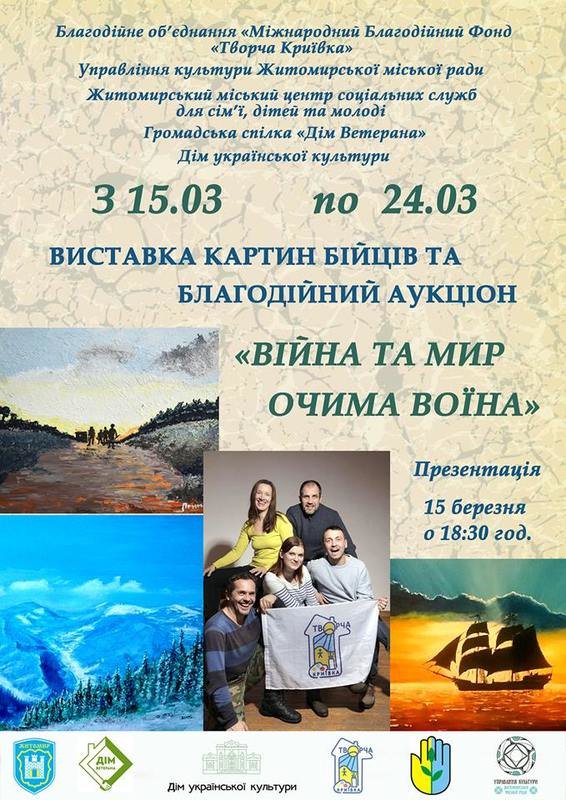 Під час виставки триває благодійний аукціон, картини з однієї частини експозиції - "Мир очима воїна" кожен відвідувач може придбати на умовах тихого аукціону.