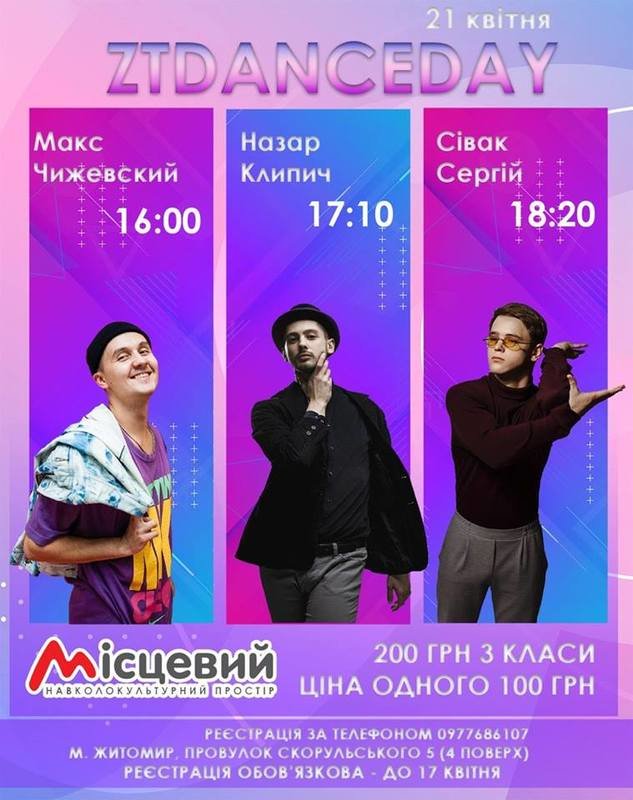 Чудові та яскраві танцювальні майстер-класи від Макса Чижевського (поч.16:00), Назара Клипича (поч. 17:00), Сергія Сівака (поч. 18:20)