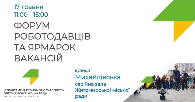 Департамент економічного розвитку Житомирської міської ради 17 травня 2019 року організовує Форум роботодавців та Ярмарок вакансій.