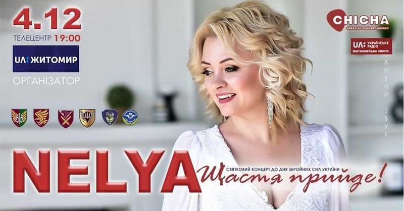 4 грудня о 19:00 у Телецентрі (вул. Театральна, 7) відбудеться сольний концерт справжньої патріотки України, військовослужбовця Збройних Сил України, учасника АТО, артистки, яка мала більш ніж 200 виступів у зоні ООС - NELYA. Організатор концерту – Суспільний мовник (телеканал UA:Житомир та радіостанція «Житомирська Хвиля») приурочив святковий концерт NELYA "Щастя прийде" до Дня Збройних сил України.