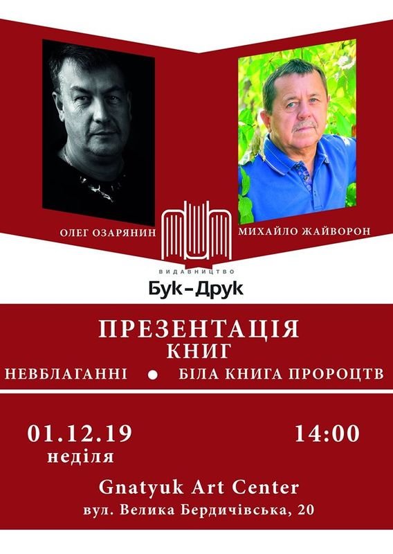 Презентація двох збірок поезій: Олег Антонюк (О. Озарянин) "Невблаганні" та Михайло Жайворон "Біла книга пророцтв", яка відбудеться в Гнатюк Арт Центрі в неділю 1.12.19 о 14:00.