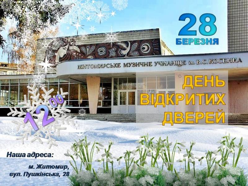 Житомирське музичне училище ім В.С. Косенка Житомирської Обласної Ради запрошує учнів 9-11 класів та їхніх батьків на ДЕНЬ ВІДКРИТИХ ДВЕРЕЙ, який пройде у суботу, 28 БЕРЕЗНЯ 2020 року!