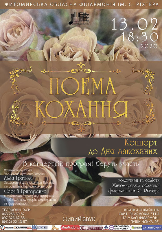 Музиканти-віртуози — заслужена артистка України Лілія Гратила та Заслужений діяч культури Польщі, лауреат численних міжнародних конкурсів Сергій Григоренко представляють яскраву програму з найвідоміших творів для скрипки та фортепіано.
