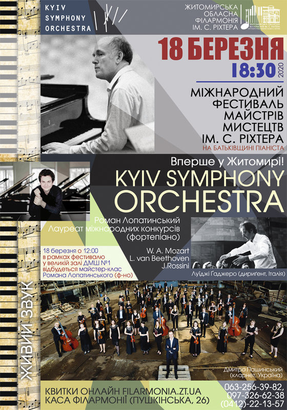 Увага! 5,8,12 ряд — Абонементи! Ціна 5,8 ряд — 330 грн., 12 ряд — 290 грн. За абонементами звертайтесь до каси філармонії або купуйте онлайн на сайті. Програма оркестру: W. A. Mozart, L. van Beethoven, J.Rossіnі. Роман Лопатинський Лауреат міжнародних конкурсів (фортепіано) 18 березня о 12:00 в рамках фестивалю у великій залі ДМШ №1 відбудеться майстер-клас Романа Лопатинського (ф-но)