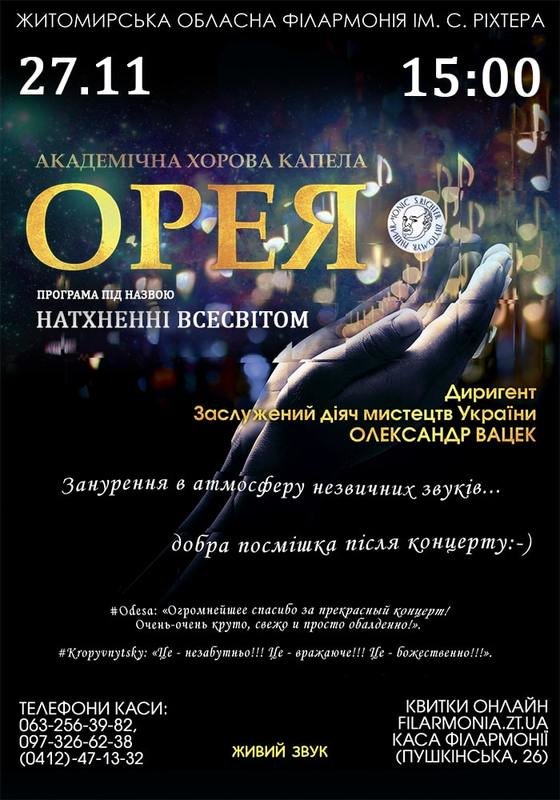 Для Вас мы ежедневно собираем самые невероятные события города, которые могут вам подарить яркие эмоции и незабываемые впечатления. Афиша Житомира на 0412.ua — все то, что стоит увидеть, попробовать и почувствовать. Самая полная информация о культурной жизни города! Все события в ночных клубах, кинотеатрах, концертных залах, ресторанах и др. — все это и многое другое, вы найдете в Афише сайта города Житомира 0412.ua!