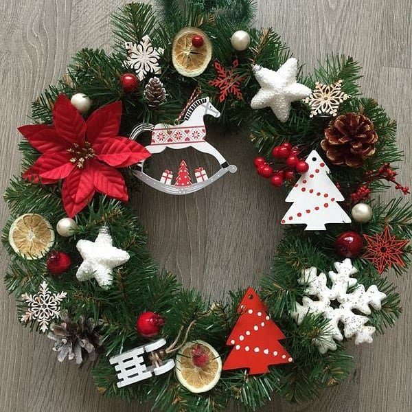 Вінок зі штучної ялинки, 50 сантиметрів, з оздобленням. Вартість — 350 грн.
