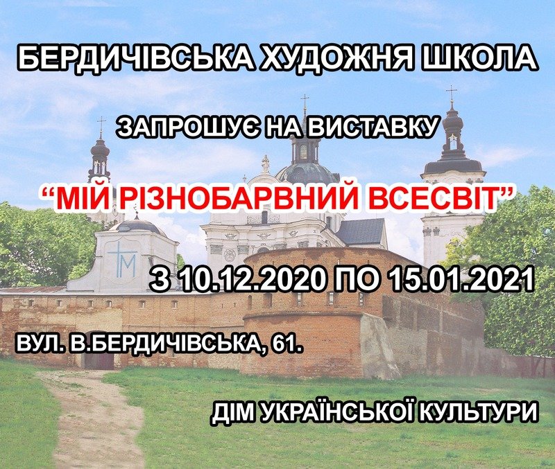 Бердичівська художня школа має нагоду представити до огляду творчу виставку «Мій різнобарвний всесвіт», над якою плідно працювали учні разом зі своїми наставниками.Всесвіт – як особистий світогляд, такий безмежний і неосяжний. Це всесвіт сучасної творчої особистості, де у чомусь великому поєднується пошана до традицій минулого, сприйняття та відношення до дійсності і закладається велика надія на щасливе майбутнє. Так наші маленькі мрійники відчувають і живуть.