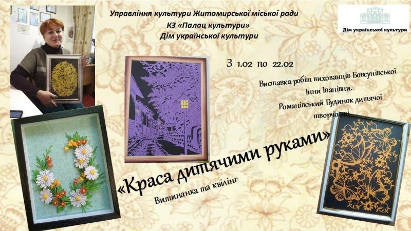 З 1.02 по 22.02 в Домі української культури проходитиме виставка робіт вихованців майстра народної творчості Бовсунівської Інни Іванівни, керівника гуртків Романівського Будинку дитячої творчості.