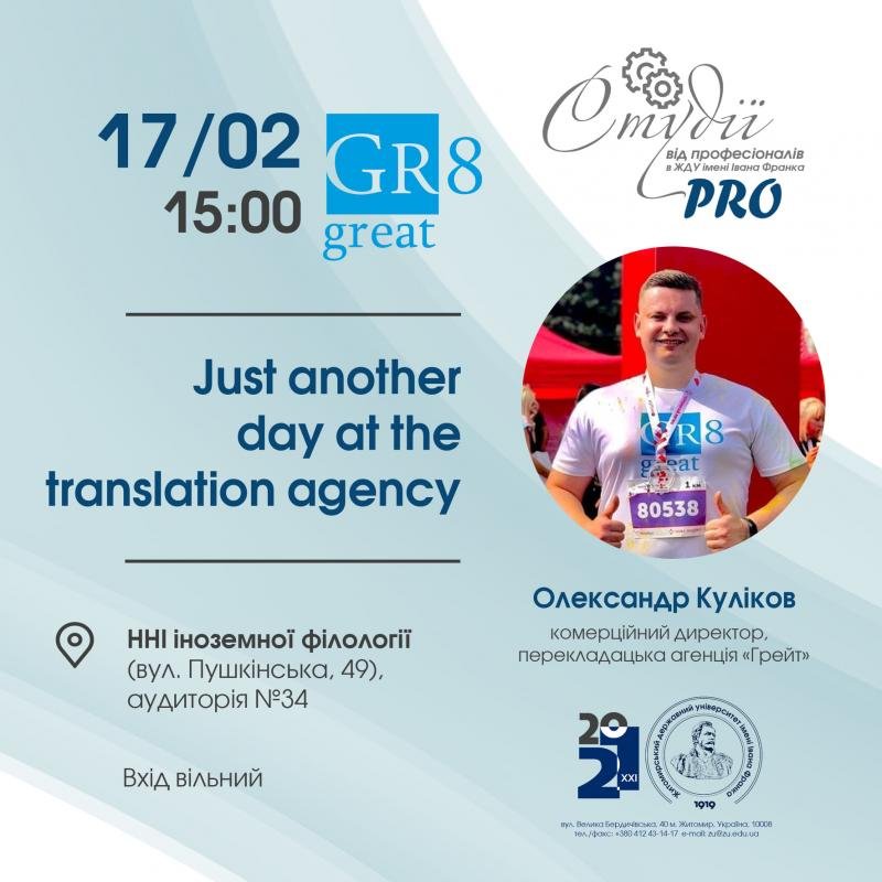 У рамках проєкту "PRO студії від професіоналів в ЖДУ імені Івана Франка" 17 лютого о 15:00 відбудеться зустріч з Олександром Куліковим, комерційним директором перекладацької агенції «Грейт».