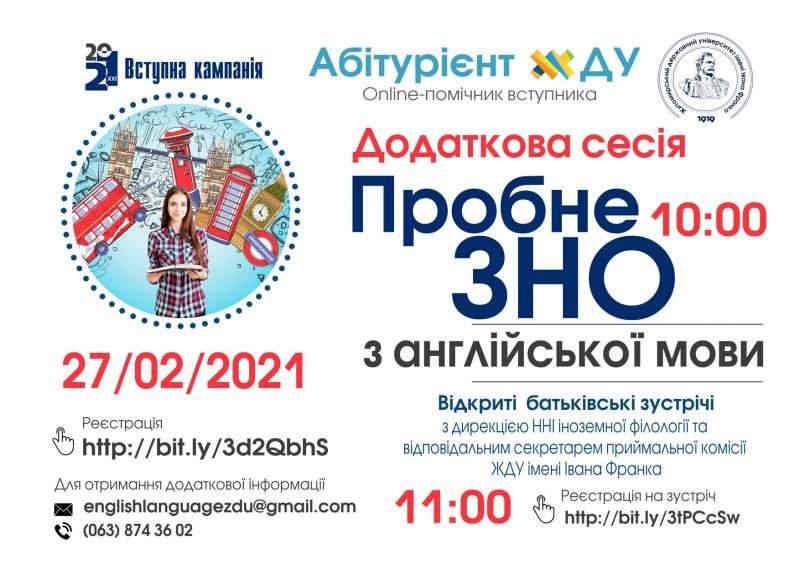 Додаткова сесія безкоштовного пробного ЗНО з англійськоїмови та відкрита зустріч батьків з дирекцією ННІ іноземної філології та відповідальним секретарем приймальної комісії ЖДУ імені Івана Франка