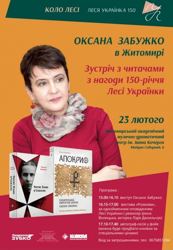 Громадська організація «Житомир, зроби голосніше!» в рамках проекту «Коло Лесі» розпочинає урочисті заходи в Житомирі до 150-річчя від Дня народження нашої землячки зустріччю-лекцією Оксани Забужко та моновиставою творчої майстерні «Театр у кошику» за однойменним оповіданням Лесі Українки «Розмова».