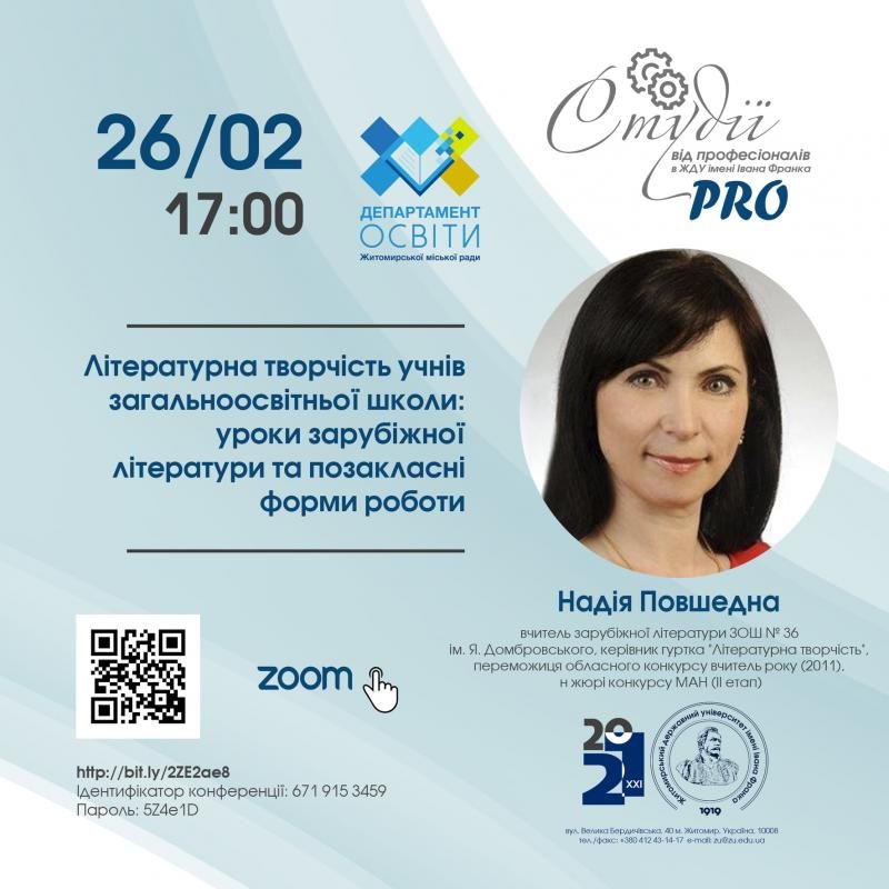 У рамках проєкту "PRO студії від професіоналів ЖДУ імені Івана Франка" 26 лютого о 17:00 відбудеться відкрита зустріч з вчителем зарубіжної літератури ЗОШ № 36 ім. Я. Домбровського, керівником гуртка "Літературна творчість", переможицею обласного конкурсу вчитель року (2011), членом жюрі конкурсу МАН (ІІ етап) Надією Повшедною.