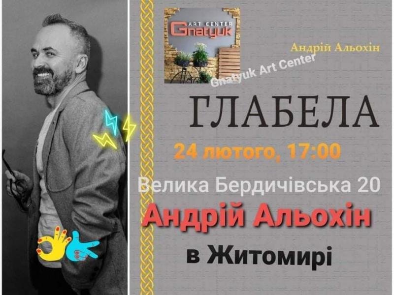 24 лютого о 17:00 в Gnatyuk Art Center (Велика Бердичівська, 20) актор, блогер і письменник Андрій Альохін читає свої оповідання в рамках туру на підтримку його нової книжки «Глабела».