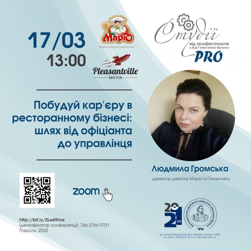У рамках проєкту "PRO студії від професіоналів в ЖДУ імені Івана Франка" 17 березня о 13:00 відбудеться відкрита зустріч з директором дивізіону Маріо та Плезентвіль Людмилою Громською.