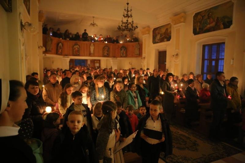 О, воістину благословенна ніч, у якій єднається небо з землею, справи Божі зі справами людськими. Тому просимо Тебе, Господи, нехай ця свічка, освячена на славу Твого імені, палає безустанно, щоб розсіяти темряву цієї ночі. Прийнята Тобою як аромат приємний, нехай з’єднається вона з вогнями неба. Нехай ця свічка горить, коли зійде сонце, що не знає заходу. Ісус Христос, Твій Син Воскреслий. Котрий освічує людство своїм світлом і з Тобою живе і царює на віки віків» (Exultet)Літургія СловаУ Пасхальну ніч Церква запрошує всіх вірних на трапезу Божого Слова. Можна образно сказати, що на столі Слова з’являється дев’ять «страв» – дев’ять читань зі Старого і Нового Завіту. Біблійні читання змальовують перед нашими очима найважливіші елементи історії Божого спасіння – від сотворення світу до славного Воскресіння Христа. Усі образи Старого завіту є провіщення приходу Месії та Його царства. Особливе місце у Літургії Слова займає опис виходу Ізраїльского народу з єгипетської неволі, який є прообразом Воскресіння Христа, а також нашого переходу до нового життя.Після кожного читання є молитва, котра є досконалим коментарем до нього.