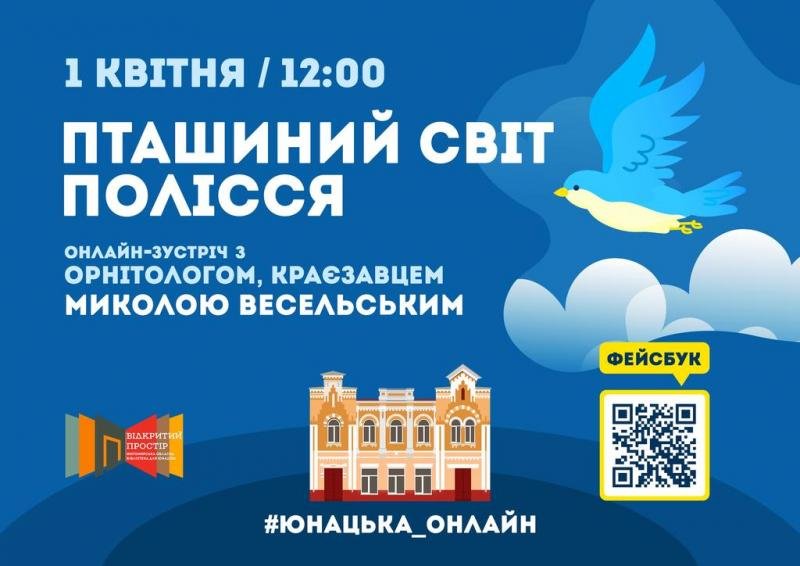 1 квітня 2021 року о 12:00 в обласній бібліотеці для юнацтва до Всесвітнього дня птахів відбудеться онлайн-зустріч «Пташиний світ Полісся» за участі українського орнітолога, науковця, члена Житомирської національної спілки краєзнавців України, члена ГО «Українське товариство охорони птахів» Миколи Весельського.