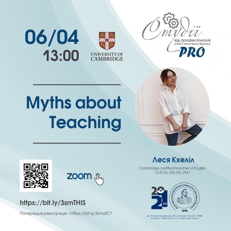У рамках проєкту "PRO студії від професіоналів в ЖДУ імені Івана Франка" 6 квітня о 13:00 відбудеться зустріч з cambridge-certified teacher of English (CELTA, DELTA), PhD Лесею Кхеліл на тему "Myths about Teaching".