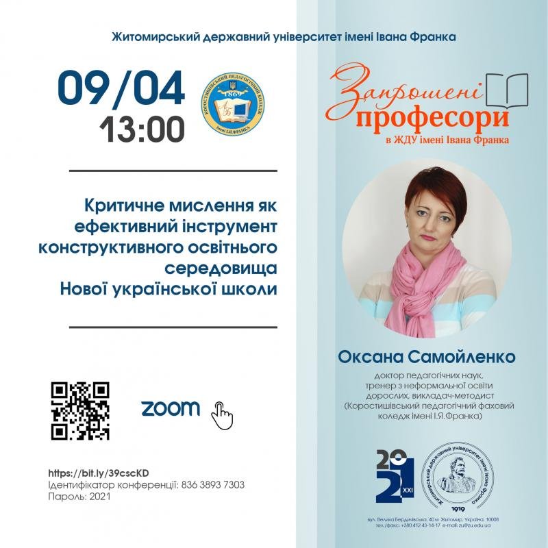 У рамках проєкту "Запрошені професори в ЖДУ імені Івана Франка" 9 квітня о 13:00 відбудеться відкрита лекція доктора педагогічних наук, тренера з неформальної освіти дорослих, викладача-методиста Коростишівський педагогічний фаховий коледж імені І.Я.Франка на тему "Критичне мислення як ефективний інструмент конструктивного освітнього середовища Нової української школи".