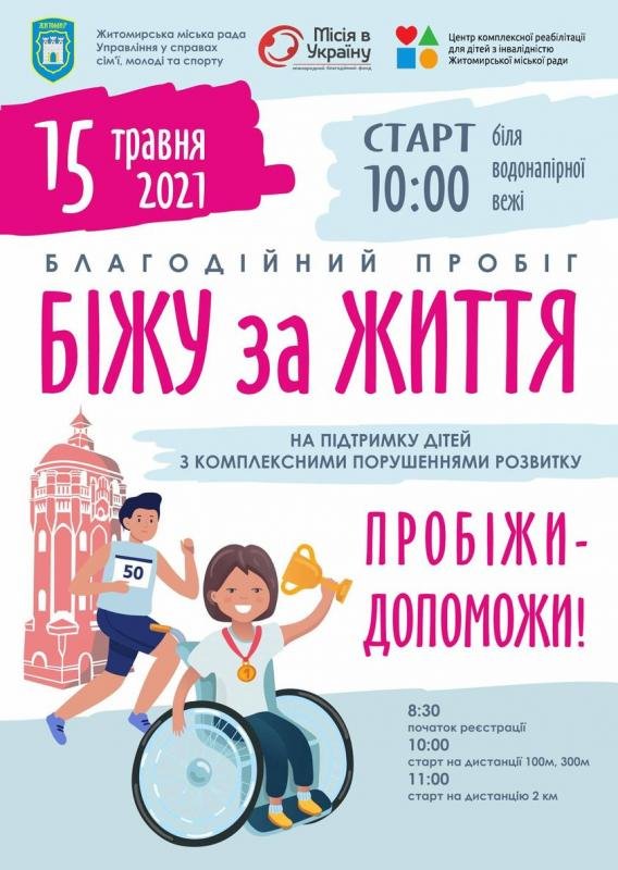 Проведення Благодійного пробігу "Біжу за життя" планується провести 15 травня на підтримку дітей з інвалідністю - підопічних Центру комплексної реабілітації для дітей з інвалідністю ЖМР та Місії в Україну