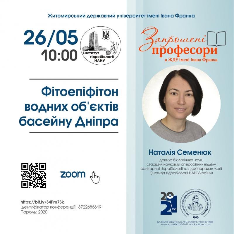 У рамках проєкту "Запрошені професори в ЖДУ імені Івана Франка" 26️ травня о 10:00 відбудеться відкрита лекція Наталії Семенюк, доктора біологічних наук, старшого наукового співробітника відділу санітарної гідробіології та гідропаразитології Інституту гідробіології НАН України.