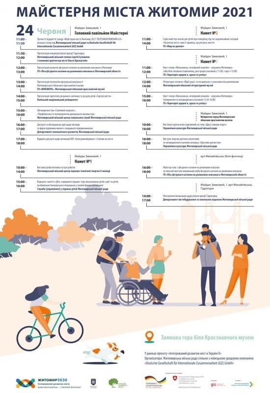 24 червня з 10.00 та ще упродовж наступних двох днів (до 26 червня) ходіть на Замковий Майдан там спорудили ціле містечко (Майстерня міста Житомир) для Вашого культурно-освітнього дозвілля, а головне: розкажуть про зміни, які чекають на місто