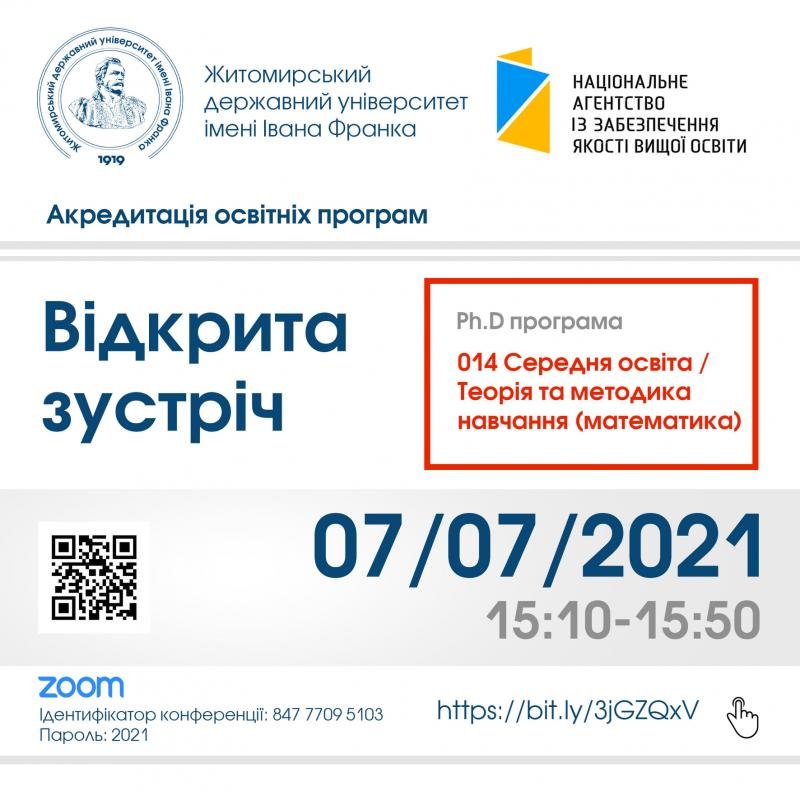 7 липня о 15:10 в Житомирському Державному Університеті імені Івана Франка відбудеться відкрита зустріч з експертами Національного агентства із забезпечення якості вищої освіти з приводу акредитації освітньої програми 014