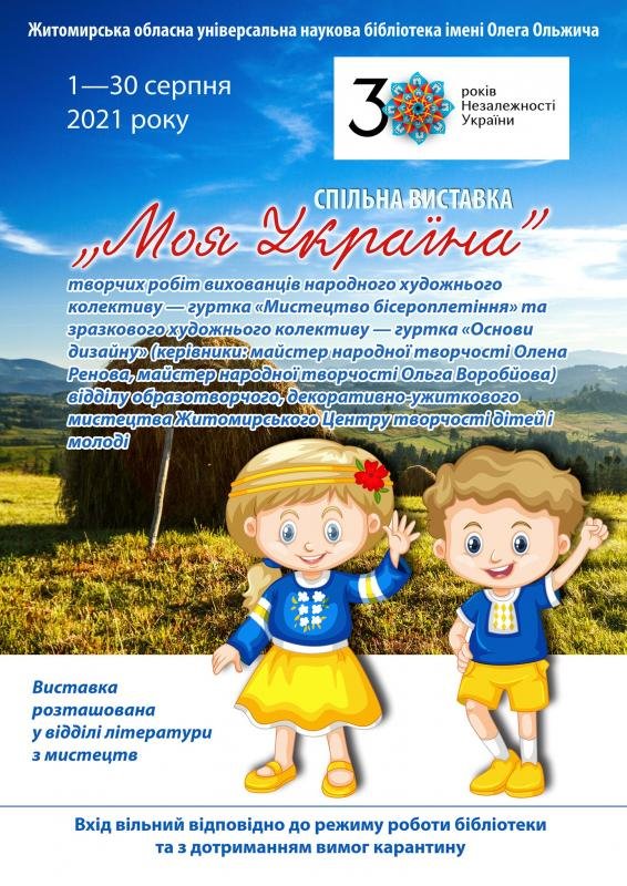 З 1 по 30 серпня 2021 року у відділі літератури з мистецтв експонуватиметься спільна виставка «МОЯ УКРАЇНА» творчих робіт вихованців народного художнього колективу — гуртка «Мистецтво бісероплетіння» та зразкового художнього колективу — гуртка «Основи дизайну» (керівники: майстер народної творчості Олена Ренова, майстер народної творчості Ольга Воробйова) відділу образотворчого, декоративно-ужиткового мистецтва Житомирського Центру творчості дітей і молоді.