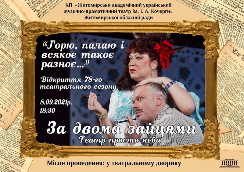 8 вересня ми відкриваємо 78-й театральний сезон музичною комедією "За двома зайцями" М.Старицького, муз.О.Стецюка, режисер - н.а. України Григорій Артеменко.